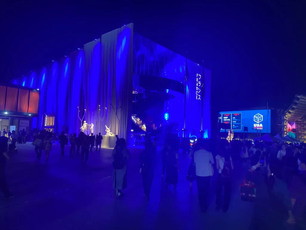 夜のフランス館は、国旗のトリコロール──青・白・赤──の光に包まれ、