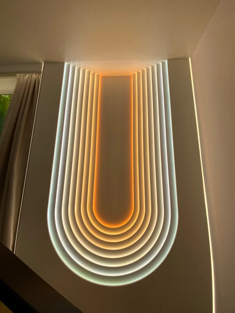 背面発光は、文字の裏側から光を放つタイプです。壁をほんのり照らすような柔らかい印象の演出が可能で、高級感や落ち着きある雰囲気を出したいときにおすすめです。金属文字でよく使用されますが、室内では金属文字だと重圧感が出るので樹脂文字の背面小口を光らせた同様の効果を出す種類もあります。
