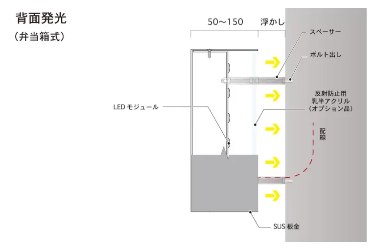 この理想的な光の輪郭を作るためには、文字を壁から何ミリ浮かせて取り付けるかという、非常に繊細な設計が求められます。壁からの距離が近すぎると光が詰まって見え、遠すぎると光がぼやけて文字の形が分かりにくくなってしまいます。