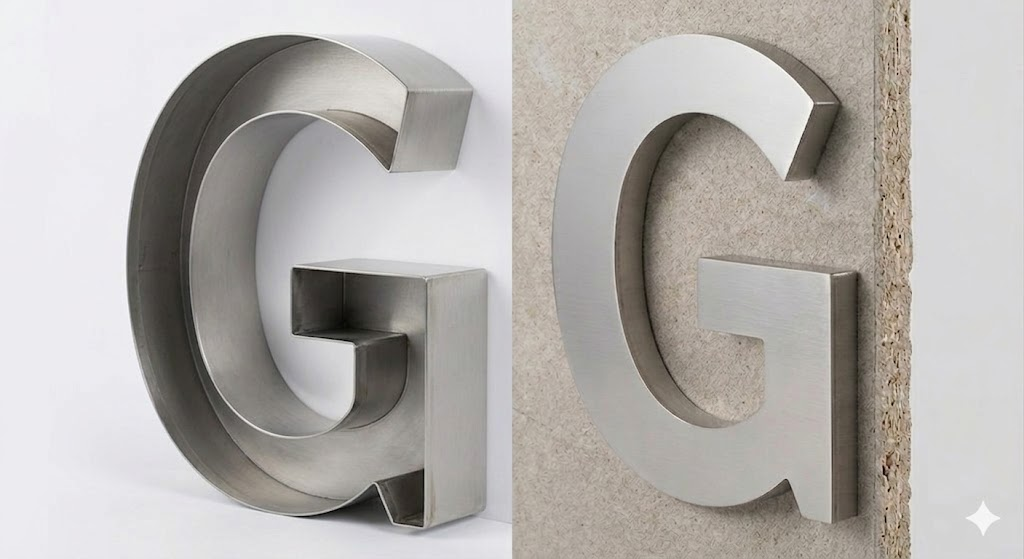 | 構造 | ステンレス板を曲げ加工・溶接して立体的な「箱」を作る。厚み(奥行き)がある。 | ステンレス板を文字の形に「切り出す」。厚みは板の厚みそのもの。 |
